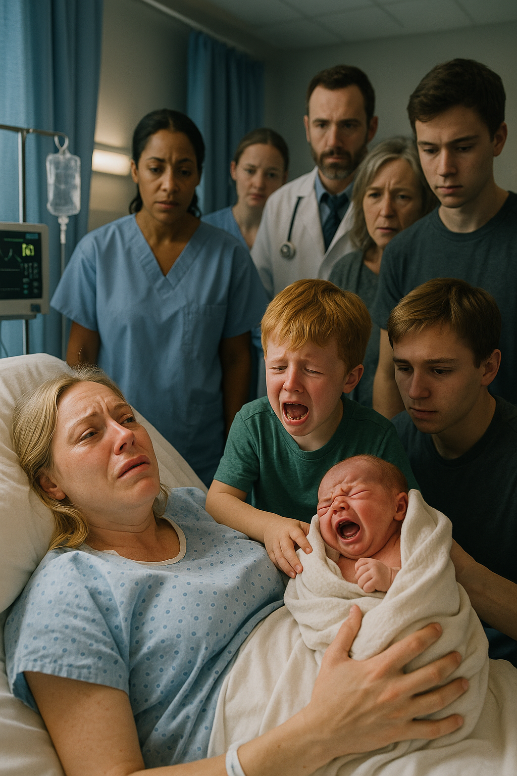 Jacob entered quietly, clutching a stuffed bear to his chest. His small voice trembled as he said, “Mommy?” Emily nodded through tears, unable to speak. The nurse handed him the swaddled baby. Jacob’s hands shook as he stared down at his brother’s peaceful face.