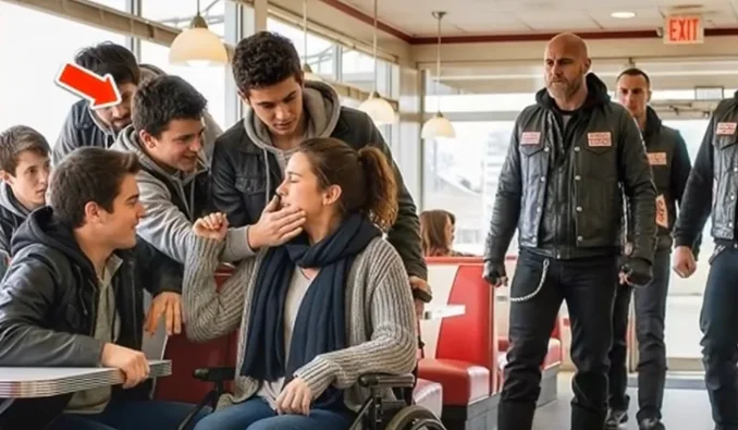 Then the man’s expression hardened as he glanced toward the window. The same group of teenagers who had bullied Clara earlier had returned to the parking lot, lingering near their car. The bikers exchanged glances, and without a word, several of them stepped outside. Through the window, everyone in the diner could see what happened next—not a confrontation, but a lesson. The bikers surrounded the teens, not in aggression, but in quiet authority. The leader walked up to them and said in a low, steady voice, “You thought it was funny to pick on someone who couldn’t fight back. How about you apologize like decent human beings?”