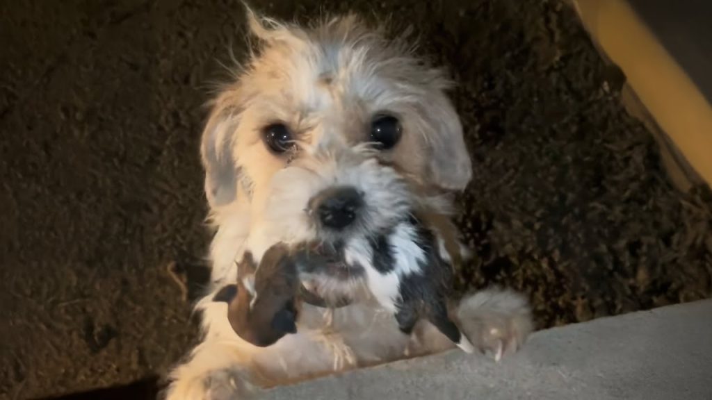 In a lonely stretch of countryside, far from busy roads and human comfort, a mother dog clung to hope under circumstances no living creature should have to endure. She was painfully thin, her ribs visible beneath her fur, and a frayed rope still hung from her neck, a cruel sign that she had once belonged to someone who chose to abandon her. Left to survive on her own, she faced hunger, exhaustion, and exposure, yet her focus never wavered. Everything she had left was poured into protecting the tiny lives that depended on her.